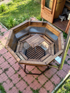 Банный чан на подставке изготовлен из пищевой стали. Представляет собой большую ёмкость в виде чаши, при нагревании которой можно париться на свежем воздухе. Чан установлен на устойчивую металлическую подставку и оборудован кедровым бортом, скамейками, подспинниками, трапом для ног и приставной лестницей. Нагревание банного чана происходит от обычного костра. Если оборудовать данную модель печью, то банные процедуры можно принимать даже зимой.